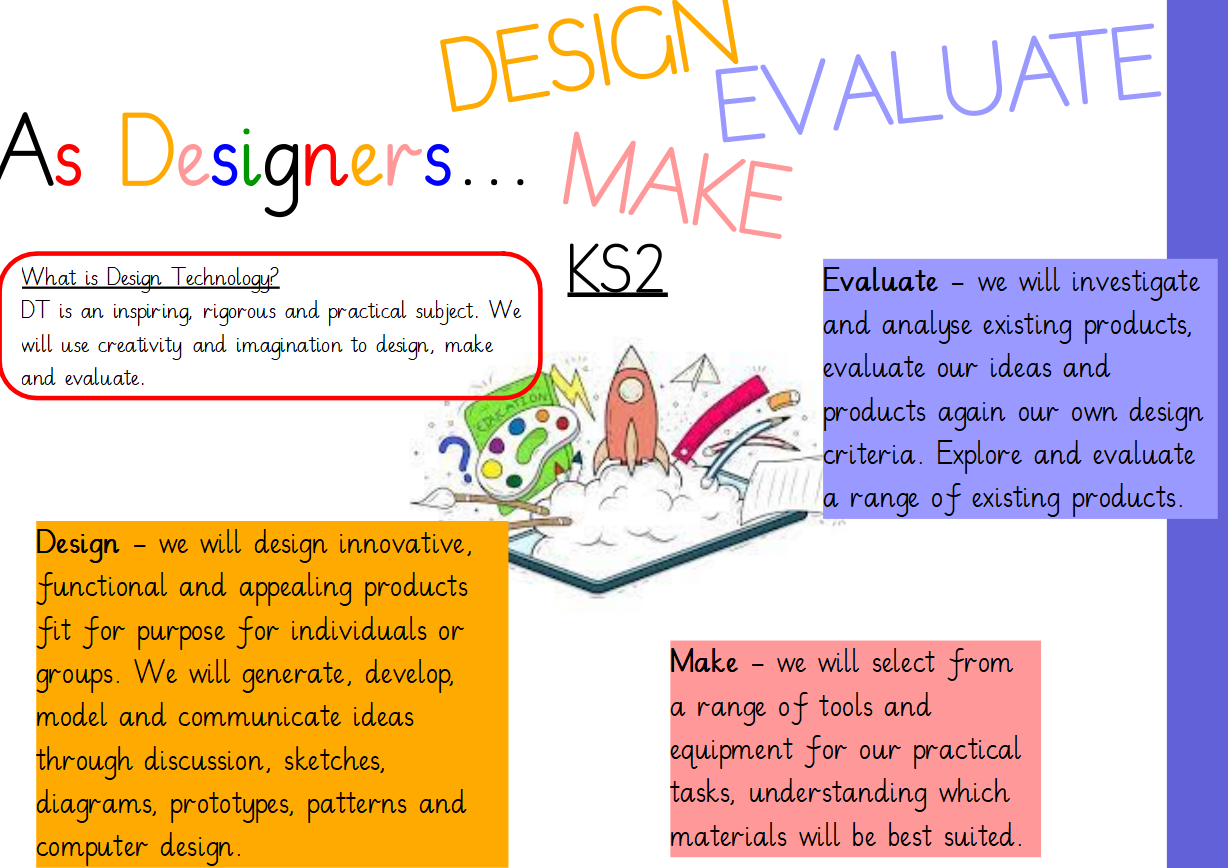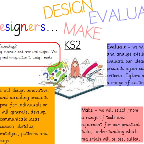 Purpose of Study: Design and technology is an inspiring, rigorous and practical subject. Using creativity and imagination, pupils design and make products that solve real and relevant problems within a variety of contexts, considering their own and others’ needs, wants and values. They acquire a broad range of subject knowledge and draw on disciplines such as mathematics, science, engineering, computing and art. Pupils learn how to take risks, becoming resourceful, innovative, enterprising and capable citizens. Through the evaluation of past and present design and technology, they develop a critical understanding of its impact on daily life and the wider world. High-quality design and technology education makes an essential contribution to the creativity, culture, wealth and well-being of the nation.
