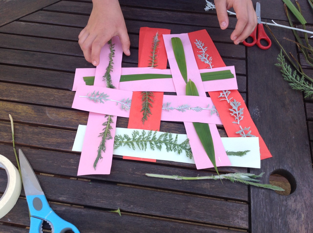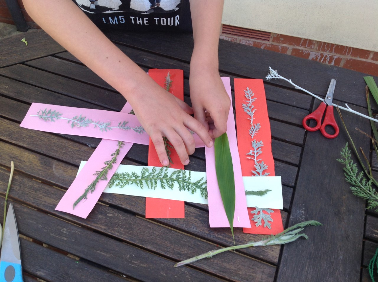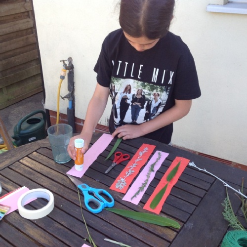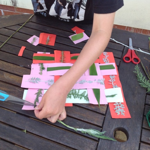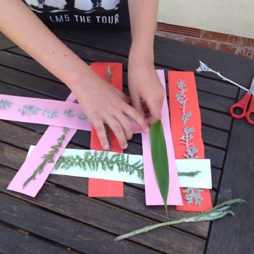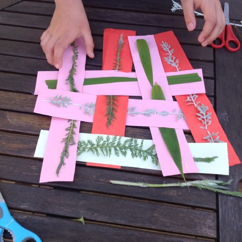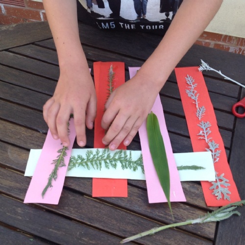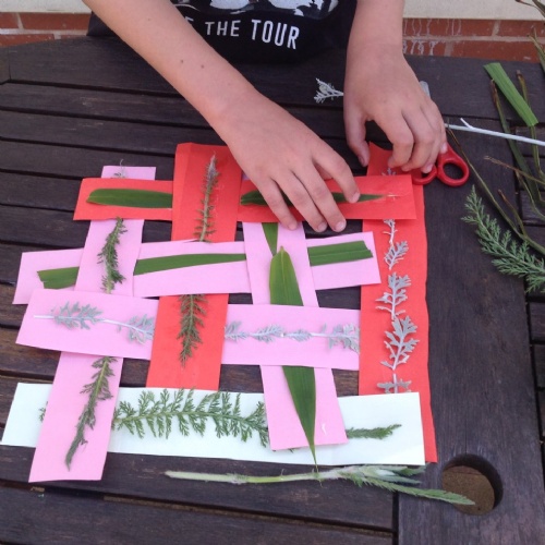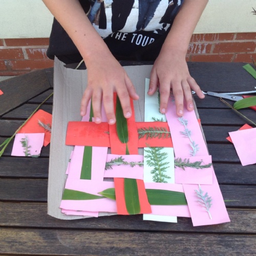 Textiles: investigate weaving. You will need cardboard, scissors, glue and leaves or flowers from the garden.