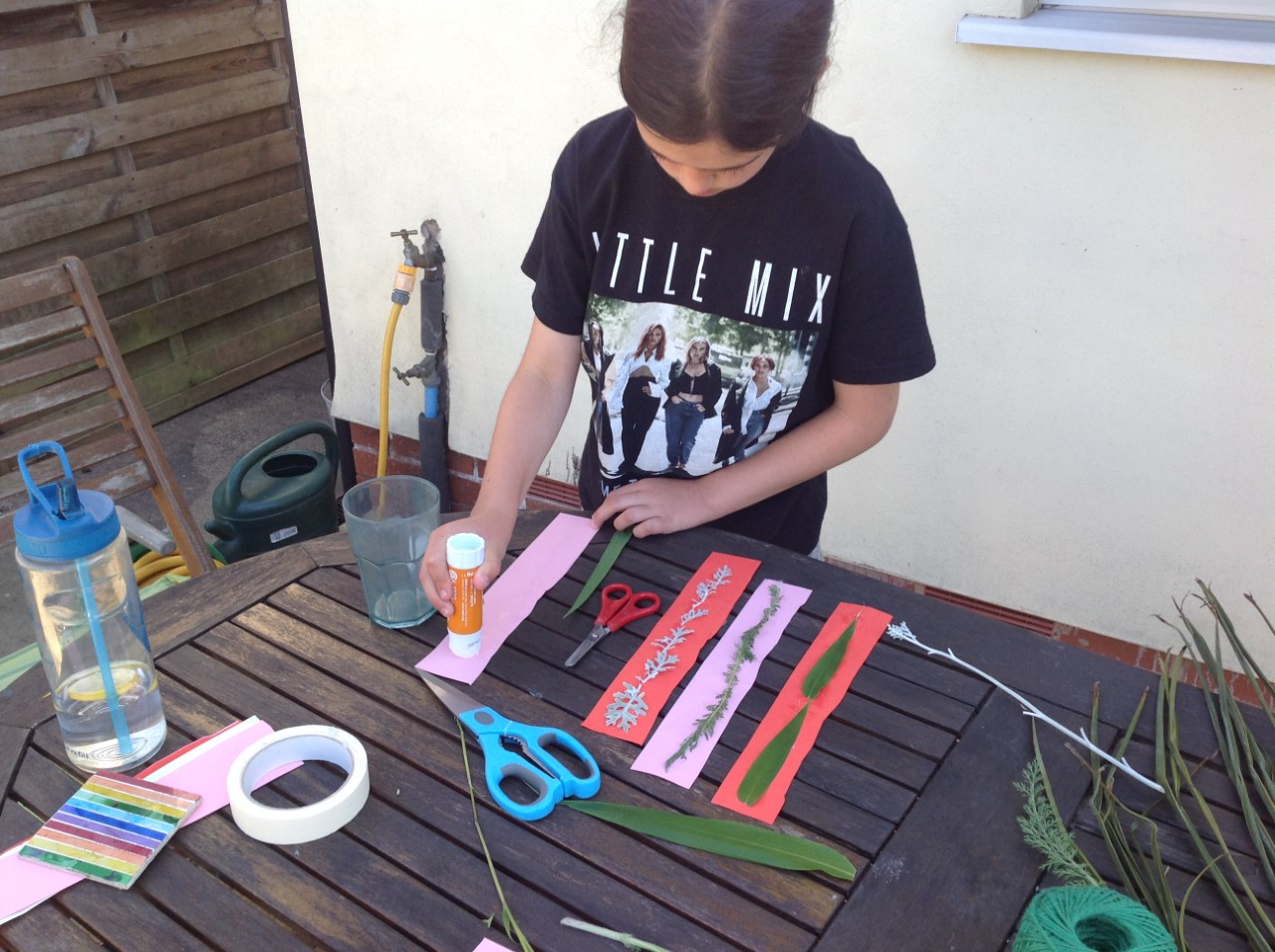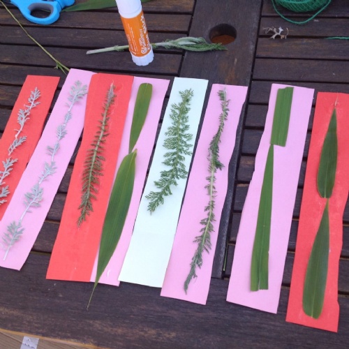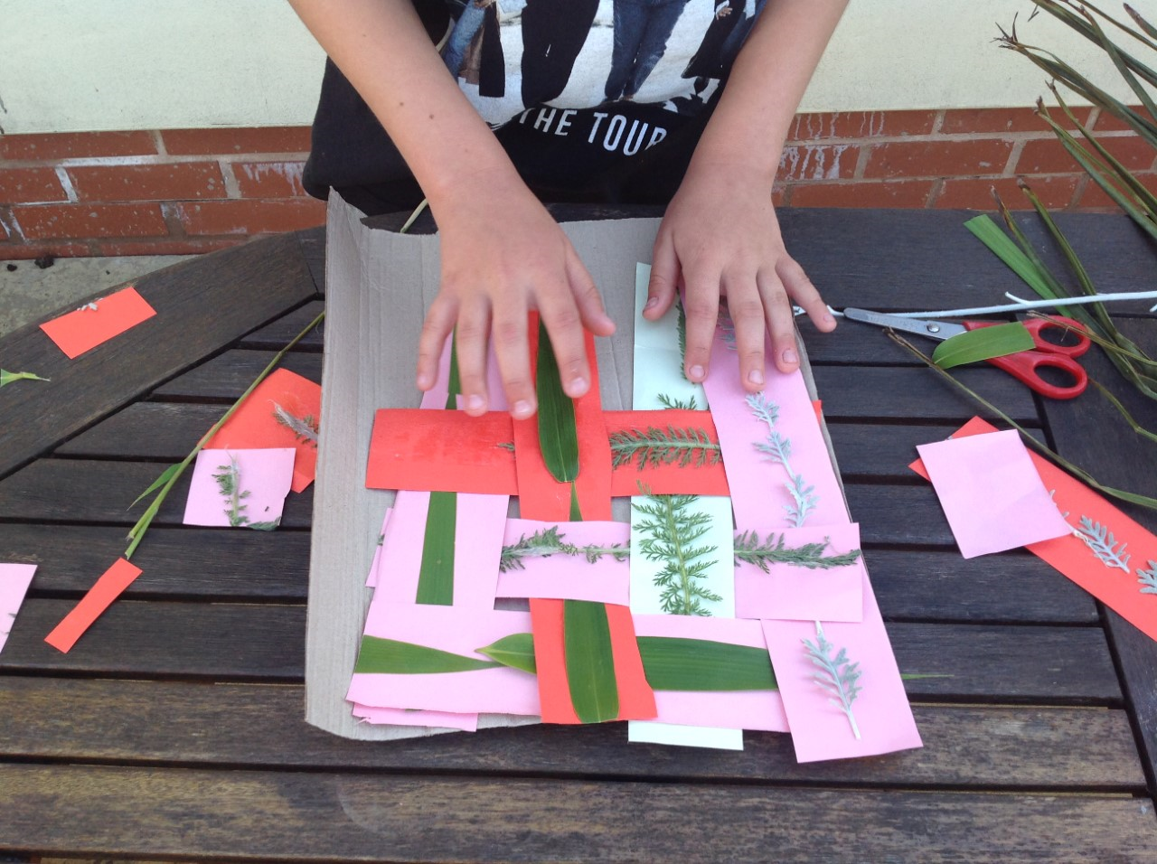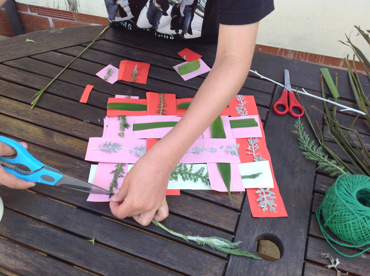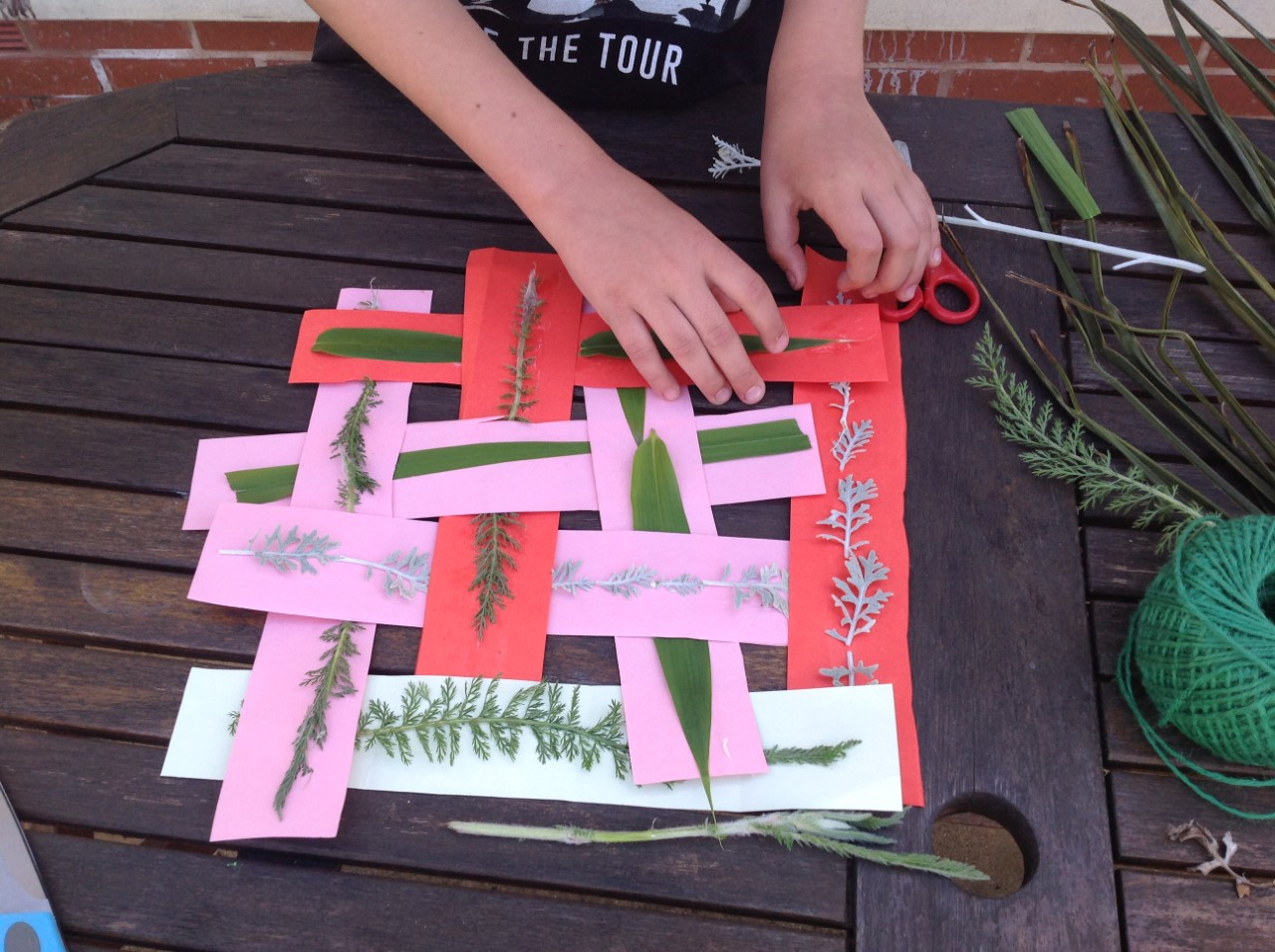 Textiles: investigate weaving. You will need cardboard, scissors, glue and leaves or flowers from the garden.